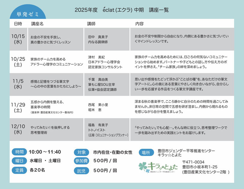 ▶「座学で学ぶ」単発セミナー /▶「体験で学ぶ」6回連続セミナー / ▶無料個別フォローアップ/ ▶参加者の声 / ▶主な講師の紹介